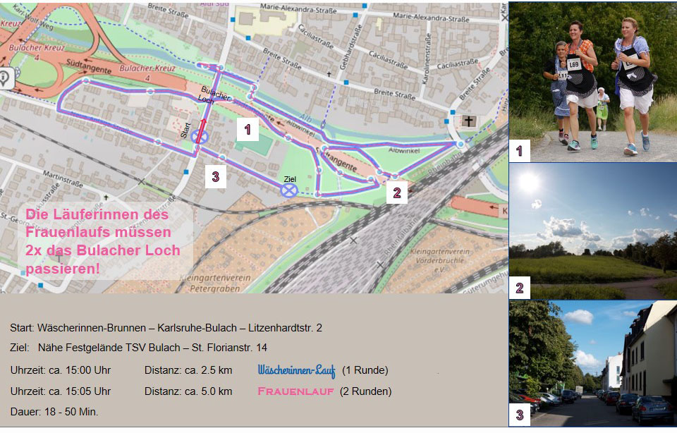 Der Start des Wäscherinnen-Laufs und des Frauenlaufs Karlsruhe befindet sich wie in den Jahren zuvor in unmittelbarer Nähe des Bulacher Wäscherinnenbrunnens in der Neue-Anlage-Straße 2. Danach passieren die Läuferinnen das „Bulicher Loch“, um dann gleich scharf links in einer 180-Grad-Kurve in den asphaltierten Fußgänger-und Radweg an der Alb einzubiegen. Anschließend geht es rechts über die Brücke und dann parallel der schönen Alb. In einer langen Geraden führt die Strecke weiter Richtung der Beiertheimer Paul Gerhardt-Kirche. Dann macht die Strecke eine Rechtskehre hinauf auf die Parkanlage über dem Edeltrud-Tunnel. Nach einer erneuten Rechtskurve in einen Feldweg hinein, laufen die Läuferinnen einen Bogen auf dem Grün am „Kaskaden-Brunnen“ vorbei. Danach schwenkt das Läuferfeld erneut rechts auf den Fußgänger-und Radweg auf dem Edeltrud-Tunnel ein. Nach dem wiederholten Passieren des „Kaskaden-Brunnens“ geht es oben auf der Grünanlage weiter, hinter dem Kunstatelier „Neue Schule“ vorbei, um schließlich wieder links in die Neue-Anlage-Straße einzubiegen. Während die Läuferinnen des Frauenlaufs Karlsruhe wieder für ihre zweite Runde vorbei am Wäscherinnen-Brunnen Richtung „Bulicher Loch“ eindrehen, rennen die Teilnehmerinnen des Wäscherinnen-Laufs im Schlussspurt auf dieser Straße weiter in die St.-Florianstraße zum großen Zieleinlauf am Wendehammer. Dieser liegt ganz in der Nähe des Geländes des Sportvereins TSV Bulach.